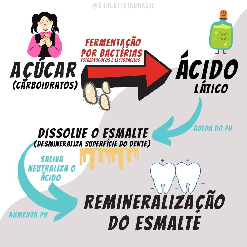 - Composição da placa dental bacteriana: todos nós temos na boca espécies de bactérias que fazem a fermentação do açúcar liberando ácidos. A questão é quanto mais bactérias, mais intensa e mais rápida será essa liberação. Entretanto essa quantidade de bactérias é algo que nem eu nem você podemos mensurar em casa, então torna-se irrelevante no cotidiano.